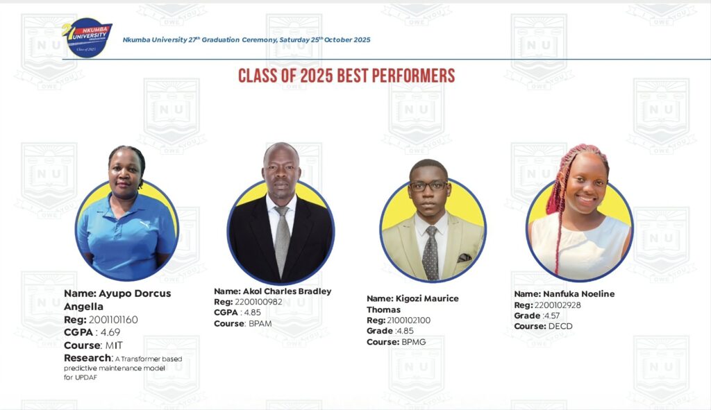 At the undergraduate level, Akol Charles Bradley and Kigozi Maurice tied as the best-performing students with a CGPA of 4.85, while Nanfuka Noeline topped the diploma category with a CGPA of 4.57.